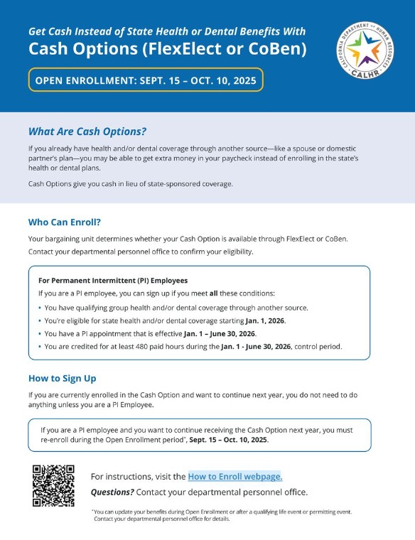 Find an informational flyer about cash options including who is eligible to enroll and how to sign up.