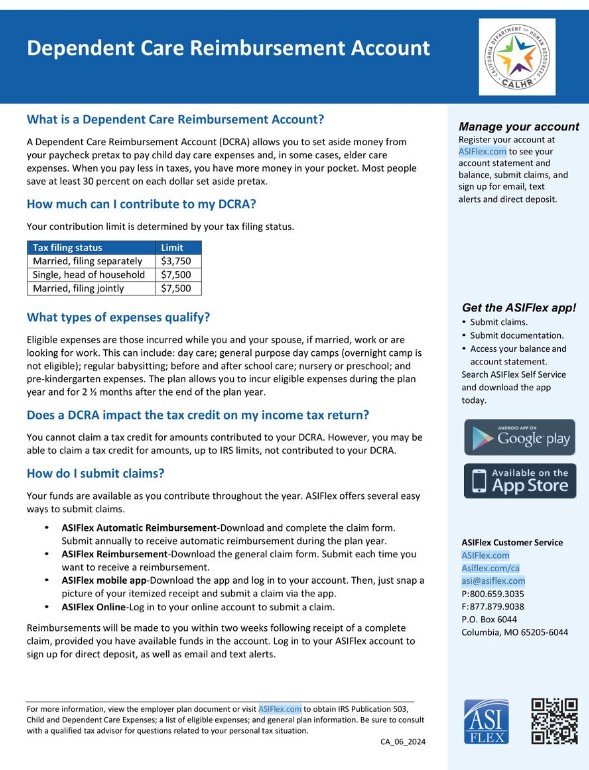 Find a flyer about Dependent Care Reimbursement Accounts, including contribution amounts and what expenses qualify.