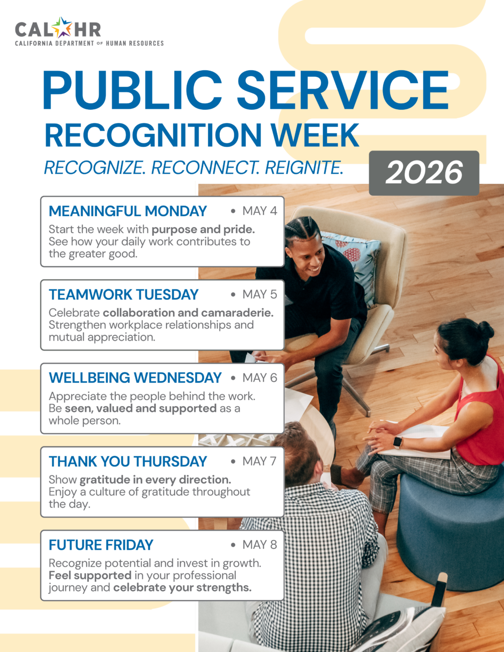 Benefits for a Life Well Lived: Discover What’s Available to You – Focus on how benefits can enhance daily life by encouraging employees to take a moment today to explore one benefit they haven’t used yet and see how it can support what matters most to them. Visit CalHR Benefits to learn more.